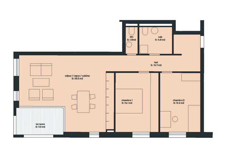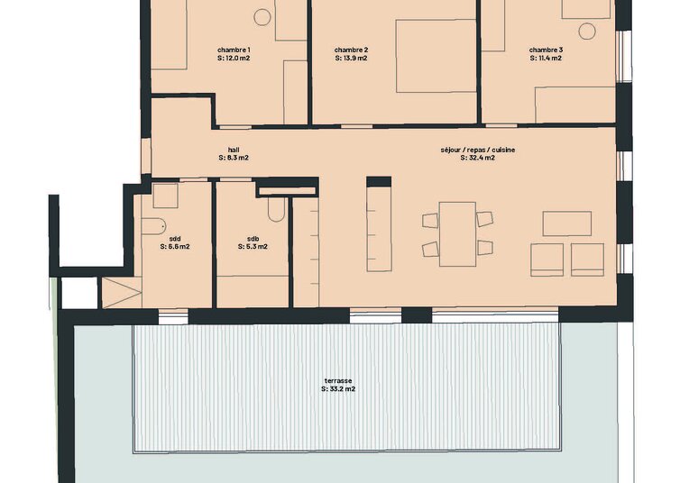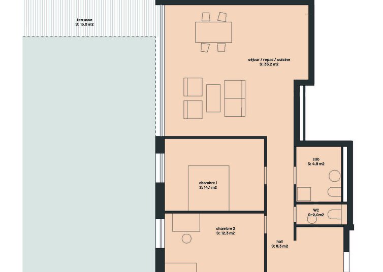 Plan de l‘appartement - terrasse - sud b-3.2, étage 3, 3.5 pièces